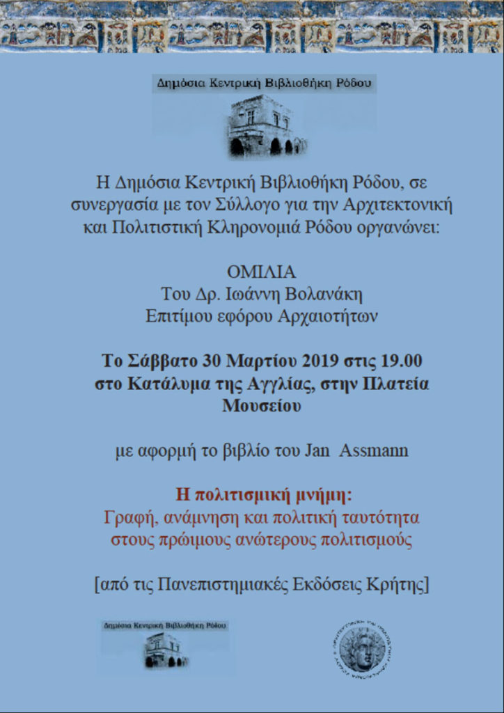 Η Δημόσια Κεντρική Βιβλιοθήκη Ρόδου σε συνεργασία με τον Σύλλογο Αρχιτεκτονικής και Πολιτιστικής Κληρονομιάς (Σ.ΑΡ.ΠΟ.Κ) Ρόδου έχει την τιμή να σας προσκαλέσει στην ομιλία του Δρ. Ιωάννη Βολανάκη, Επιτίμου Εφόρου Αρχαιοτήτων, με θέμα: «Η πολιτισμική μνήμη» με αφορμή σχετικό βιβλίο του Jan Assmann, που κυκλοφορεί από τις Πανεπιστημιακές Εκδόσεις Κρήτης. Η εκδήλωση θα πραγματοποιηθεί το […]