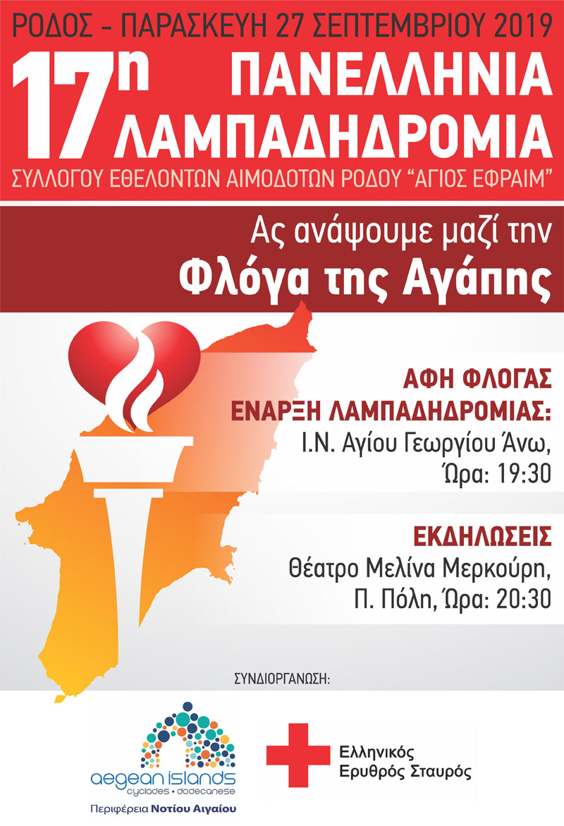 Ο Σύλλογος Εθελοντών Αιμοδοτών Ρόδου, σε συνεργασία με την Περιφέρεια Νοτίου Αιγαίου και τον Ελληνικό Ερυθρό Σταυρό σας προσκαλούν στην 17η Πανελλήνια Λαμπαδηδρομία Συλλόγων Εθελοντών Αιμοδοτών, την Παρασκευή 27 Σεπτεμβρίου 2019 και ώρα 19:30 στον Ι.Ν. Αγίου Γεωργίου(άνω).