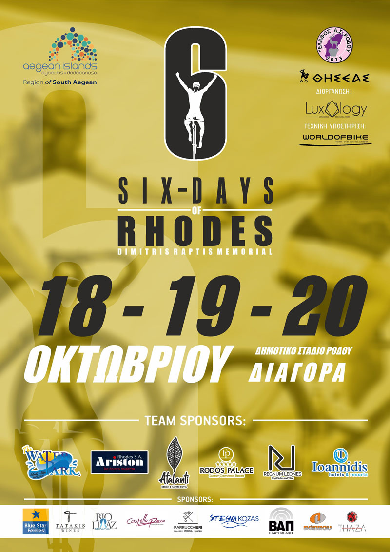 To 6 Days of Rhodes είναι το μεγαλύτερο ποδηλατικό event του 2019, το οποίο θα διεξαχθεί από τον Α.Σ. “ΕΛΑΦΟΣ” και τον Α.Ο. “ΘΗΣΕΑΣ” στο Δημοτικό Στάδιο Ρόδου “Διαγόρας” από τις 18 εώς τις 20 Οκτωβρίου 2019 υπό την αιγίδα της Περιφέρειας Νοτίου Αιγαίου με την υποστήριξη της Luxology.