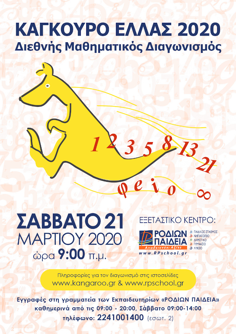 Στις 21 Μαρτίου 2020 και ώρα 09:00 το πρωί θα διεξαχθεί ο μαθηματικός διαγωνισμός «Καγκουρό» στα εκπαιδευτήρια «ΡΟΔΙΩΝ ΠΑΙΔΕΙΑ».
