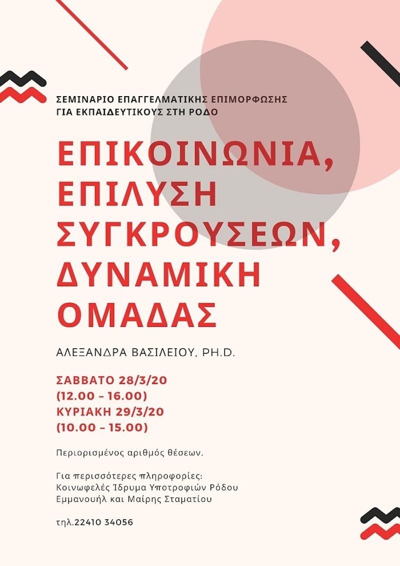 Η Επιτροπή Νεολαίας του Κοινωφελούς Ιδρύματος Υποτροφιών Ρόδου, Εμμανουήλ και Μαίρης Σταματίου, σε συνεργασία με το Processwork Hub (www.processworkhub.gr) ανακοινώνουν την διοργάνωση επιμορφωτικού σεμιναρίου για εκπαιδευτικούς με θέμα “Επικοινωνία, Επίλυση Συγκρούσεων και Δυναμική Ομάδας”. Το σεμινάριο συντονίζει η Αλεξάνδρα Βασιλείου, Ph.D., Κοινωνική Ψυχολόγος.
