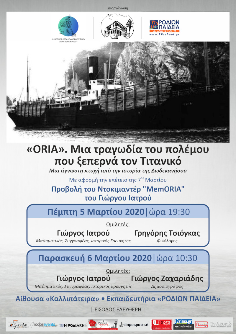 Με αφορμή τον εορτασμό της επετείου της 7ης Μαρτίου, το Διεθνές Κέντρο Συγγραφέων και Μεταφραστών Ρόδου – Δ.Ο.Π.Α.Ρ. και τα Εκπαιδευτήρια «ΡΟΔΙΩΝ ΠΑΙΔΕΙΑ» τολμούν και διοργανώνουν δύο εκδηλώσεις εξαιρετικού ενδιαφέροντος, στις οποίες αναδεικνύεται μία άγνωστη πλευρά της Ιστορίας. Ανασύρεται από τη λήθη ένα ναυάγιο, το μεγαλύτερο στη λεκάνη της Μεσογείου, με θύματα που ξεπερνούν τις απώλειες του Τιτανικού το 1912. Το ναυάγιο του τραγικού ατμόπλοιου ORIA, με θύματα περισσότερους από 4.000 Ιταλούς στρατιώτες, αιχμαλώτους της ναζιστικής Γερμανίας, είναι μία πτυχή των γεγονότων της ξενικής κατοχής στα Δωδεκάνησα, η οποία φωτίζει τις εύθραυστες σχέσεις των κρατών κατά τη διάρκεια του Β΄ Παγκοσμίου Πολέμου και αποκαλύπτει το αδυσώπητο πρόσωπο του πολέμου. Οι πρώην σύμμαχοι, Γερμανοί και Ιταλοί, βρέθηκαν σε αντίπαλα στρατόπεδα, ήδη πριν τη λήξη του πολέμου, με αποτέλεσμα οι Ιταλοί στρατιώτες της ανίσχυρης Ιταλίας του 1943, να αναμετρηθούν με δυσανάλογες, για τις δικές τους επιλογές και ευθύνες, πολιτικές αποφάσεις.