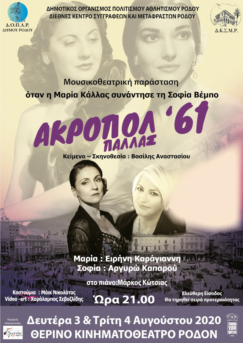 Σας προσκαλούμε σε μία μοναδική μουσικοθεατρική παράσταση, εμπνευσμένη από δύο εμβληματικές προσωπικότητες του ελληνικού και διεθνούς ρεπερτορίου, με τίτλο «ΑΚΡΟΠΟΛ ΠΑΛΛΑΣ ’61. Όταν η Μαρία Κάλλας συνάντησε τη Σοφία Βέμπο», που θα πραγματοποιηθεί τη Δευτέρα 3 και Τρίτη 4 Αυγούστου 2020, στις 9 μ.μ. στο Κινηματοτοθέατρο Ρόδον.
