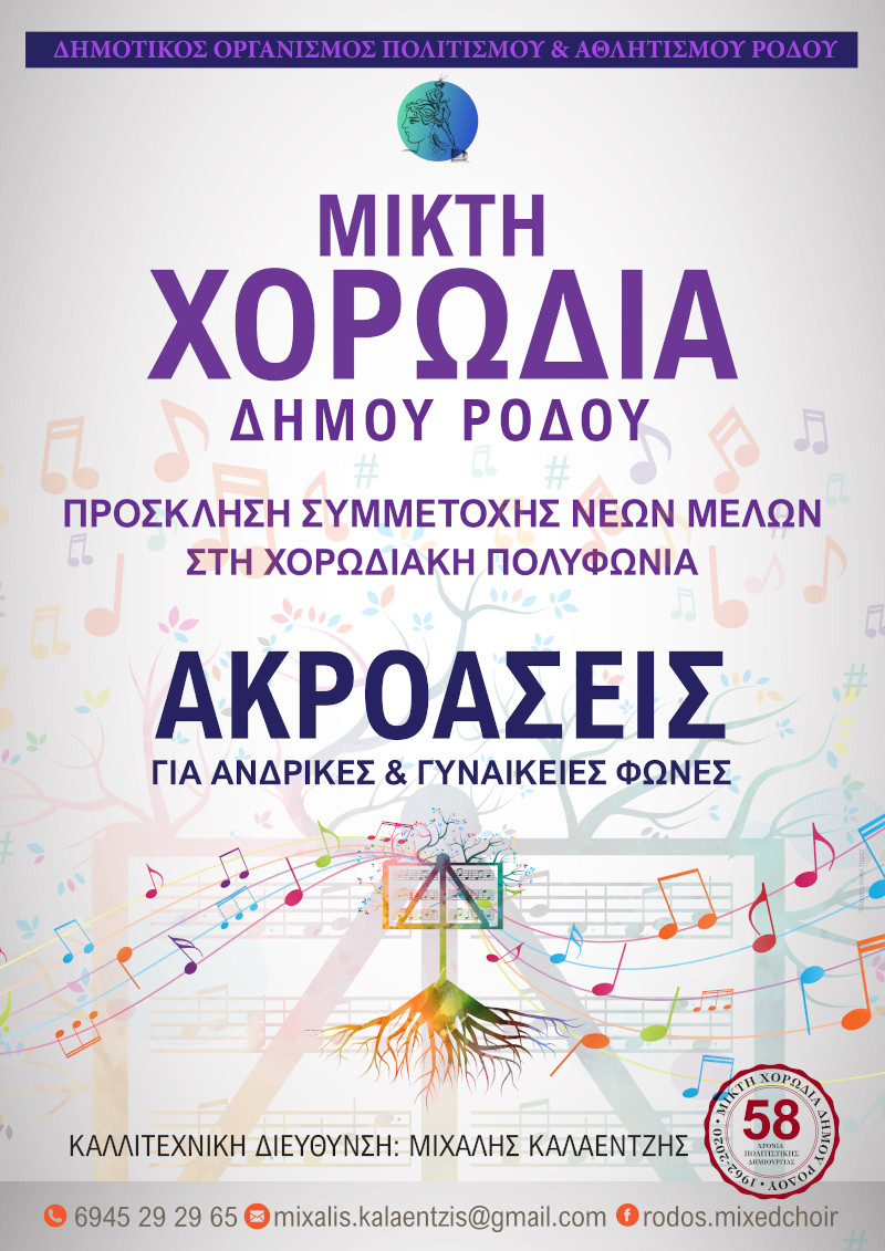 Ο Δημοτικός Οργανισμός Πολιτισμού Αθλητισμού Ρόδου ανακοινώνει ότι καλούνται νέα μέλη στη ΜΙΚΤΗ ΧΟΡΩΔΙΑ ΔΗΜΟΥ ΡΟΔΟΥ, μετά από ακρόαση.