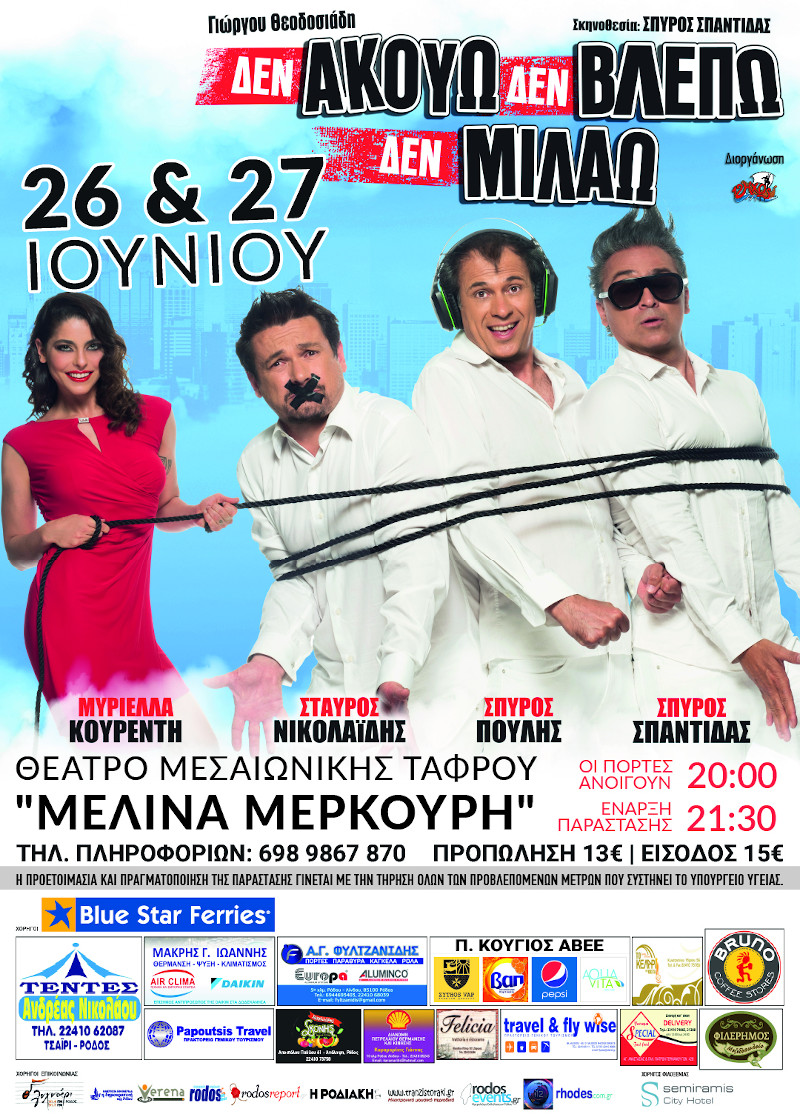 Κάποια στιγμή μπαίνει στην ζωή τους μια κοπέλα γεμάτη δύναμη και αισιοδοξία, ένας άγγελος της αγάπης. Και όλα αλλάζουν ξαφνικά. Την διεκδικούν και οι τρεις αλλά ποιος και με τι τρόπο θα την κερδίσει; Το «Δεν ακούω, δεν βλέπω, δεν μιλάω» εμπνευσμένο από έναν παλιό Ινδικό μύθο για την υπομονή και την μακροθυμία απέναντι στις δυσκολίες της ζωής, είναι μια πολύ ιδιαίτερη και ξεκαρδιστική κωμωδία. Ταυτόχρονα, όμως, είναι ένα έργο για τη συντροφικότητα, την αγάπη, την εκτίμηση, τη φιλία, τον καθημερινό αγώνα και την αισιόδοξη προσέγγιση της ζωής, σε μια εποχή που οι μαύρες σκέψεις πληθαίνουν.