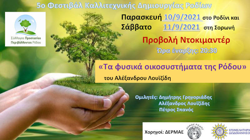 Στο πλαίσιο του 5ου Φεστιβάλ Καλλιτεχνικής Δημιουργίας Ροδίων που φέτος είναι αφιερωμένο στον αείμνηστο Θανάση Αναπολιτάνο, ο Σύλλογος Προστασίας Περιβάλλοντος Ρόδου θα προβάλει το ντοκιμαντέρ του Αλέξανδρου Λουϊζίδη με θέμα «Τα φυσικά οικοσυστήματα της Ρόδου».