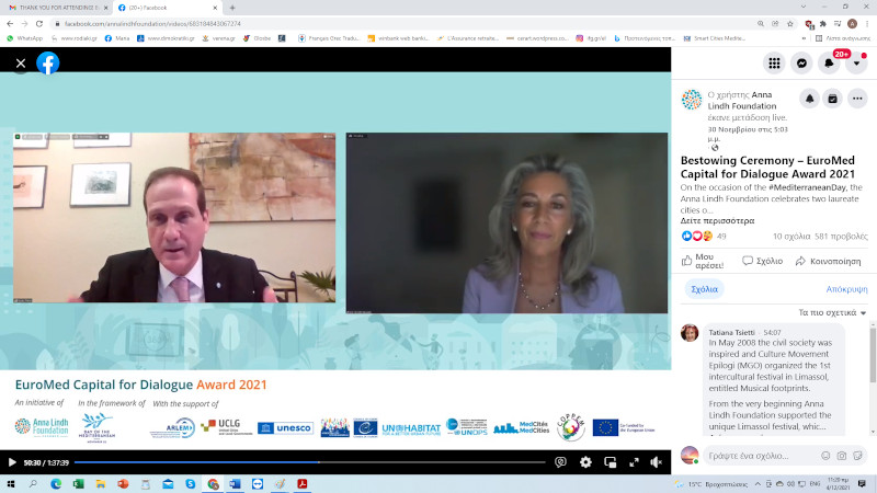 Τον τίτλο της «Ευρωμεσογειακής Πρωτεύουσας Διαλόγου» έλαβαν η πόλη της Λεμεσού της Κύπρου και η πόλη Μόσταρ της Βοσνίας – Ερζεγοβίνης και η επίσημη απονομή του 1ου Βραβείου πραγματοποιήθηκε διαδικτυακά την Τρίτη 30 Νοεμβρίου 2021. Συμμετείχαν εκπρόσωποι όλων των εμπλεκομένων φορέων ενώ μεταδόθηκε σε lifestreaming -διαδικτυακά.