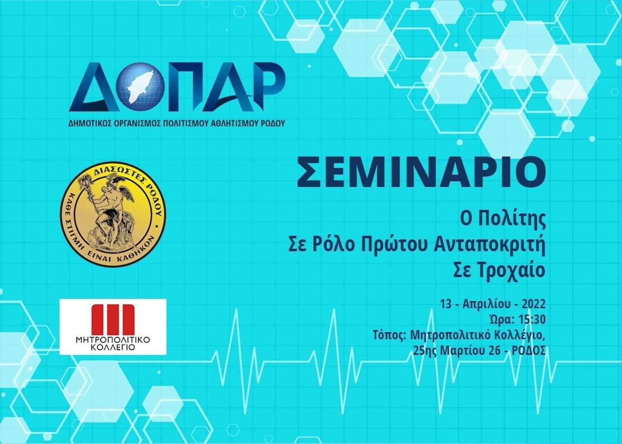 Η Εθελοντική Ομάδα «ΔΙΑΣΩΣΤΕΣ ΡΟΔΟΥ», το Μητροπολιτικό Κολλέγιο Ρόδου και ο ΔΟΠΑΡ σας προσκαλούν στo σεμινάριο με τίτλο: «Ο Πολίτης σε Ρόλο Πρώτου Ανταποκριτή σε Τροχαίο» Τετάρτη 13 Απριλίου 2022, ώρα 15:30 στο Μητροπολιτικό Κολλέγιο Ρόδου, 25ης Μαρτίου 26. Θα τηρηθούν όλα τα μέτρα προστασίας για περιορισμό της εξάπλωσης της πανδημίας του COVID-19