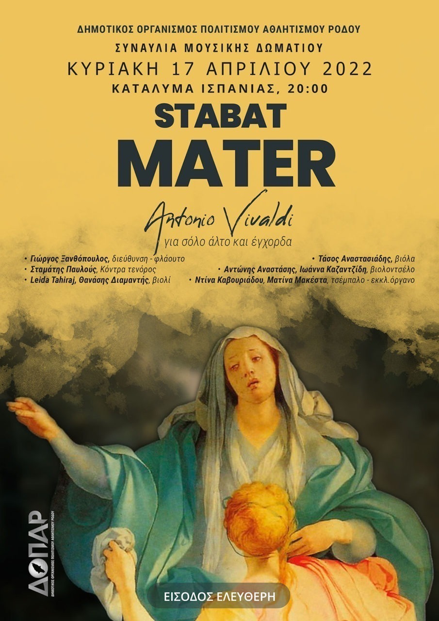 Την Κυριακή 17 Απριλίου 2022, o Δημοτικός Οργανισμός Πολιτισμού Αθλητισμού Ρόδου διοργανώνει συναυλία Μουσικής Δωματίου σε έργα: Vivaldi, Rameau, Handel, Albinoni. Κατάλυμα Ισπανίας, οδός Ιπποτών, Μεσαιωνική Πόλη της Ρόδου, ώρα 20:00. Η συναυλία τελείται με την υποστήριξη των Εκπαιδευτηρίων ΡΟΔΙΩΝ ΠΑΙΔΕΙΑ και ΡΟΔΙΩΝ ΩΔΕΙΟΝ Λίγα λόγια για το έργο “Stabat Mater dolorosa” για σόλο άλτο και […]
