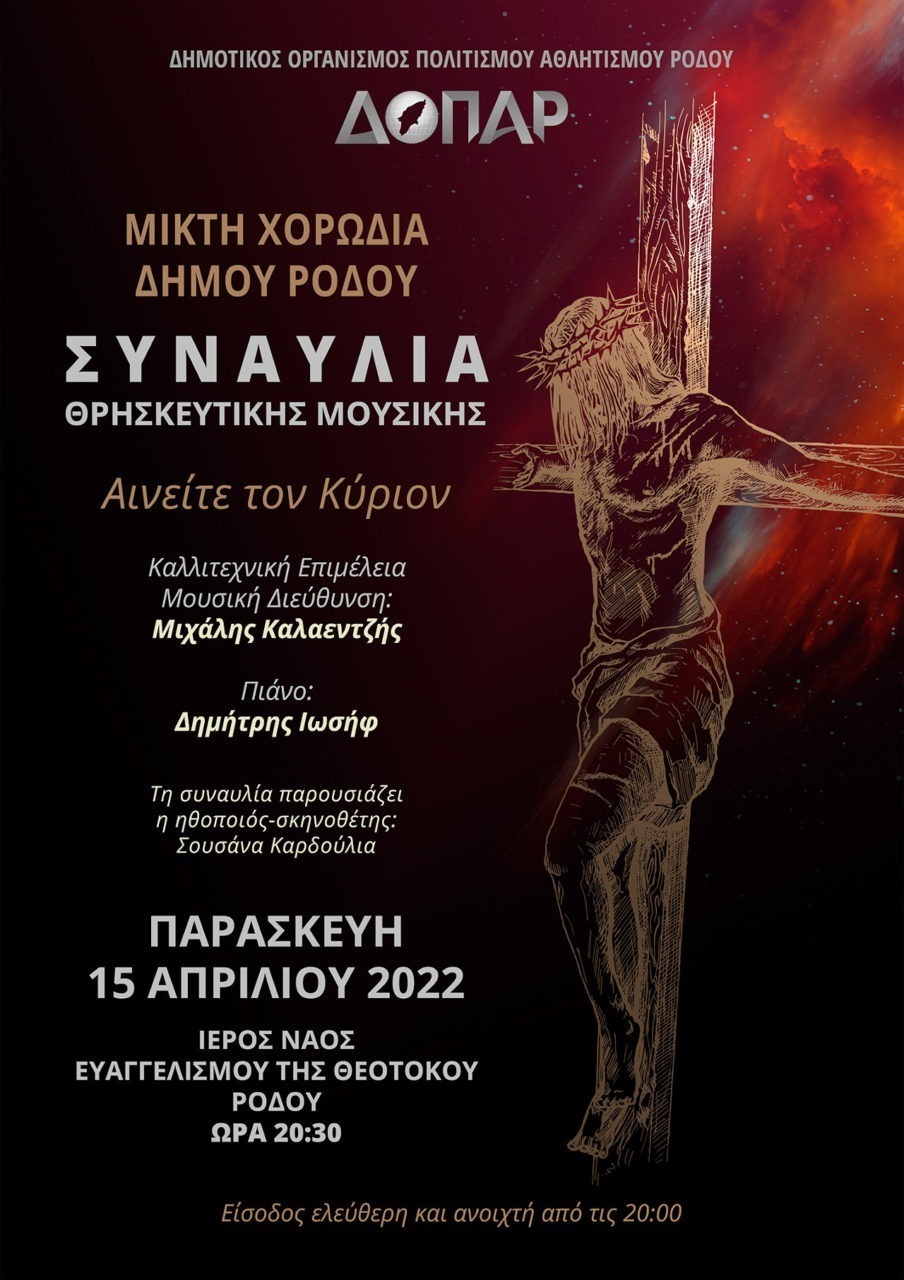 Ο Δημοτικός Οργανισμός Πολιτισμού Αθλητισμού Ρόδου σας προσκαλεί στη συναυλία της Μικτής Χορωδίας Δήμου Ρόδου με τίτλο: Αινείτε τον Κύριον Την Παρασκευή 15 Απριλίου 2022 στις 20:30 στον Ιερό Ναό του Ευαγγελισμού της Θεοτόκου Ρόδου Καλλιτεχνική Επιμέλεια – Μουσική Διεύθυνση: Μιχάλης Καλαεντζής Πιάνο: Δημήτρης Ιωσήφ Τη συναυλία παρουσιάζει η ηθοποιός – σκηνοθέτης: Σουσάνα Καρδούλια Χρήση […]