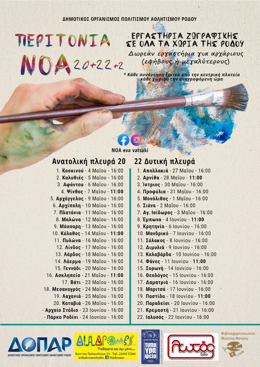 Ο Δημοτικός Οργανισμός Πολιτισμού Αθλητισμού Ρόδου διοργανώνει 20 + 22 Εργαστήρια Ζωγραφικής με την εικαστικό Βατσάκη Ευαγγελία με τίτλο «Περιτονία». Μία σειρά 44 στο σύνολο εργαστηρίων ζωγραφικής πρόκειται να πραγματοποιηθούν στα 42 χωριά του νησιού μας και δύο ακόμη στη πόλη της Ρόδου. Η ημερομηνία έναρξης είναι η 4 Μαΐου με αφετηρία το χωριό Κοσκινού. […]