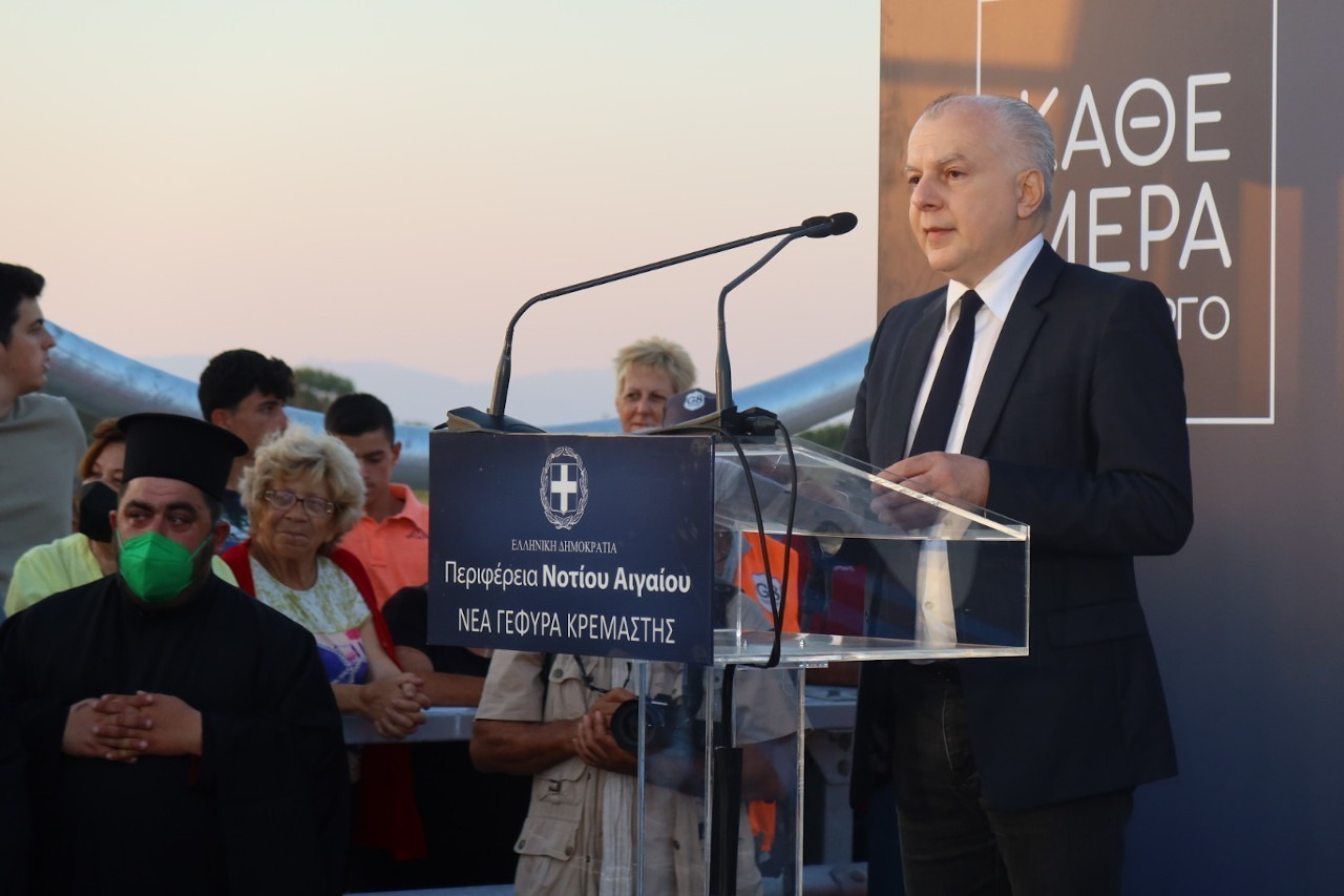 «Είναι μια ξεχωριστή και πολύ αισιόδοξη μέρα σήμερα, για τη Ρόδο. Για τη Γέφυρα, που εγκαινιάζουμε, δεν χρειάζεται να πω πολλά. Μιλάει μόνη της. Για την ασφάλειά της, την ποιότητά της, την υπερπολύτιμη συμβολή της, στην οδική σύνδεση όλης της Ρόδου, ειδικά δε, της Πόλης με το Αεροδρόμιο, που έχει κρίσιμη σημασία, και για τον τουρισμό μας, αλλά και για όλη την παραγωγική, και εμπορική δραστηριότητα, τού νησιού μας. Τα καλύτερα λόγια, είναι πάντοτε οι πράξεις, και οι περιγραφές περισσεύουν, όταν γίνεται κάτι σωστά, και υπεύθυνα.