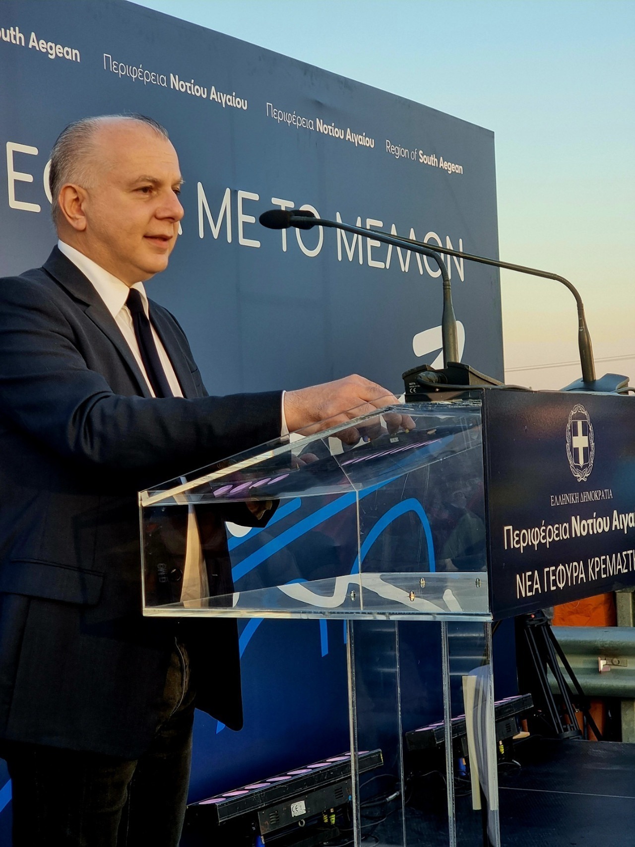 Και θέλω Κύριε Υπουργέ, να σας ευχαριστήσω θερμά, τόσο εσάς προσωπικά, αλλά στο πρόσωπό σας και όλη την κυβέρνηση του Κυριάκου Μητσοτάκη, για το επίπεδο της συνεργασίας μας, και το διαρκές ενδιαφέρον, για την πρόοδο των νησιών, και της Ρόδου μας. Η αμέριστη υποστήριξη, τής κυβέρνησής σας, στην προοπτική της βιώσιμης ανάπτυξης, με οφέλη για όλους τους νησιώτες, είναι για μας, πηγή δύναμης, να ανταποκριθούμε με τον καλύτερο τρόπο, στις προσδοκίες των συμπολιτών μας.