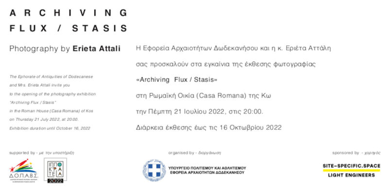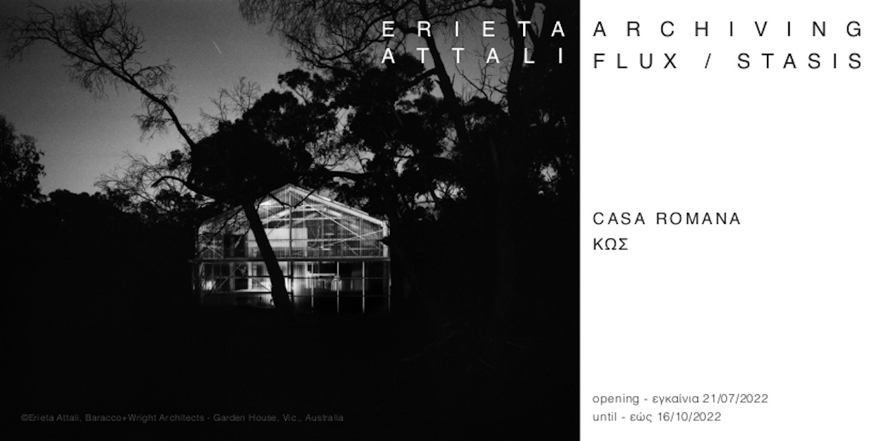 Στη Ρωμαϊκή Οικία της Κω θα φιλοξενηθεί από τις 21 Ιουλίου έως τις 16 Οκτωβρίου 2022 η έκθεση φωτογραφίας της Erieta Attali με τίτλο ARCHIVING FLUX / STASIS. Η έκθεση αποτελείται από δώδεκα έργα μεγάλων διαστάσεων με θέμα την αποτύπωση κτηρίων από γυαλί. Τα έργα συνδιαλέγονται με το χώρο μέσω της συνύπαρξης κτηρίων και τοπίων διαφορετικών πολιτισμών τα οποία βρίσκονται στις πέντε ηπείρους και συναντώνται στους χώρους της Casa Romana, τονίζοντας την αρχέγονη ανάγκη του ανθρώπου για κατοίκηση παράλληλα με την εξέλιξη της αρχιτεκτονικής.