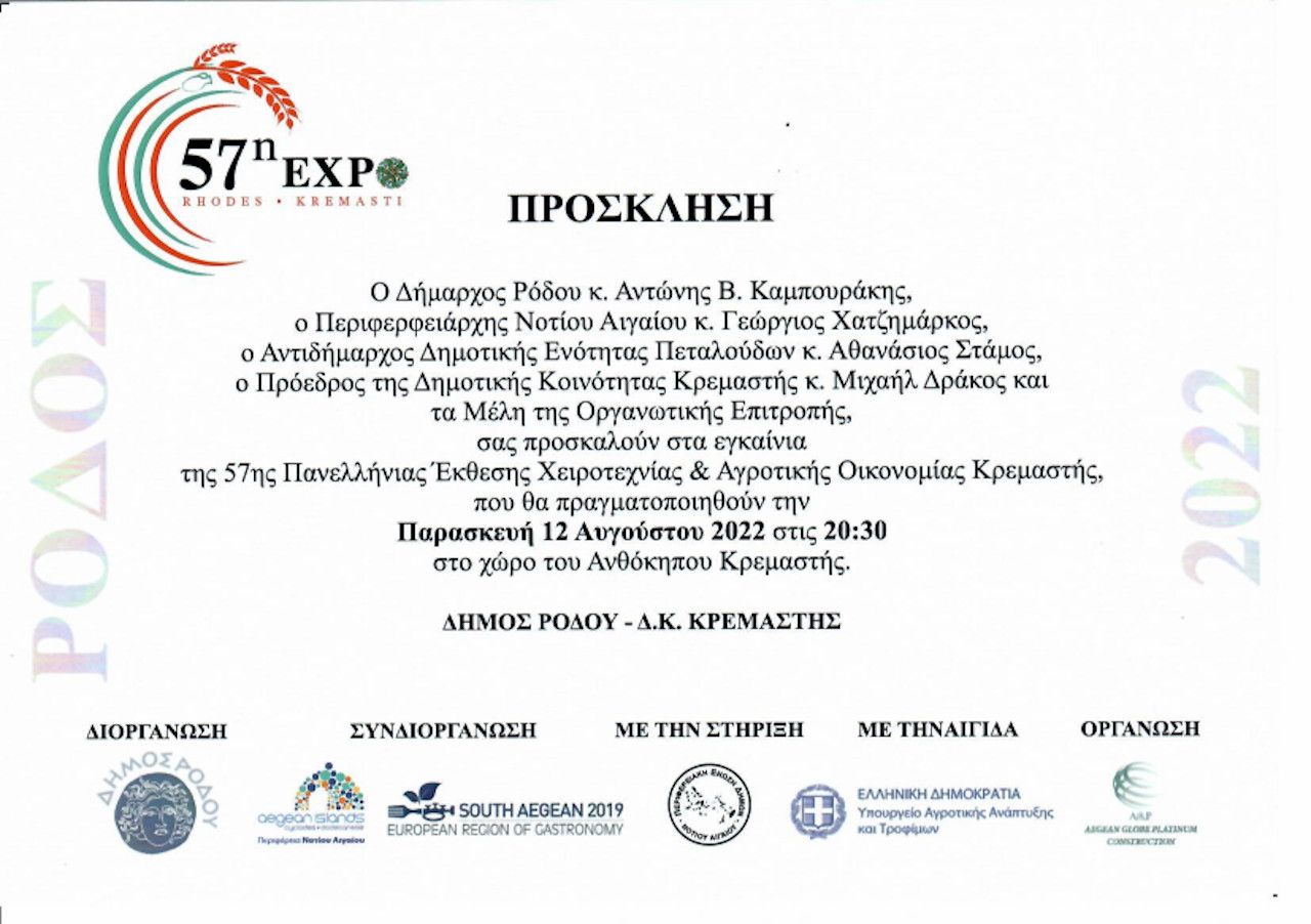 H 57η Πανελλήνια Έκθεση Χειροτεχνίας & Αγροτικής Οικονομίας Ρόδου στη Κρεμαστή, αποτελεί το μακροβιότερο πολιτιστικό γεγονός του νησιού μας από το 1965, ενώ στόχος της είναι να αναδείξει τα προϊόντα της ελληνικής χειροτεχνίας, της λαϊκής τέχνης και της ελληνικής γης, καθώς και την ελληνική καινοτομία, όχι μόνο στους ντόπιους, αλλά και στους ξένους επισκέπτες του νησιού που συρρέουν κατά χιλιάδες.