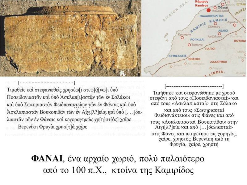 Στις 24 Οκτωβρίου του 2007 ημέρα της παρουσίασης του βιβλίου «Φάνες και τοπική διάλεκτος» στο Ακταίον της Ρόδου, ο γνωστός έγκριτος Αρχαιολόγος Δρ. Ιωάννης Χριστ. Παπαχριστοδούλου, ανακοίνωσε την εύρεση επιγραφής το 2004 στη πόλη της Ρόδου που επιβεβαιώνει την ύπαρξη του ονόματος Φάναι, το οποίο μάλιστα αναγράφεται δύο φορές. Κατά τον ίδιο τον κ. Παπαχριστοδούλου, θεωρείται η περίοδος του 2ου π.X. αιώνα.