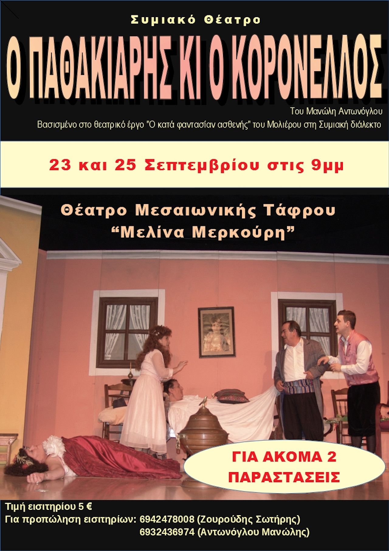 Που είναι βασισμένο στο θεατρικό έργο του Μολιέρου “Ο κατά φαντασίαν ασθενής” φυσικά στη συμιακή διάλεκτο.
