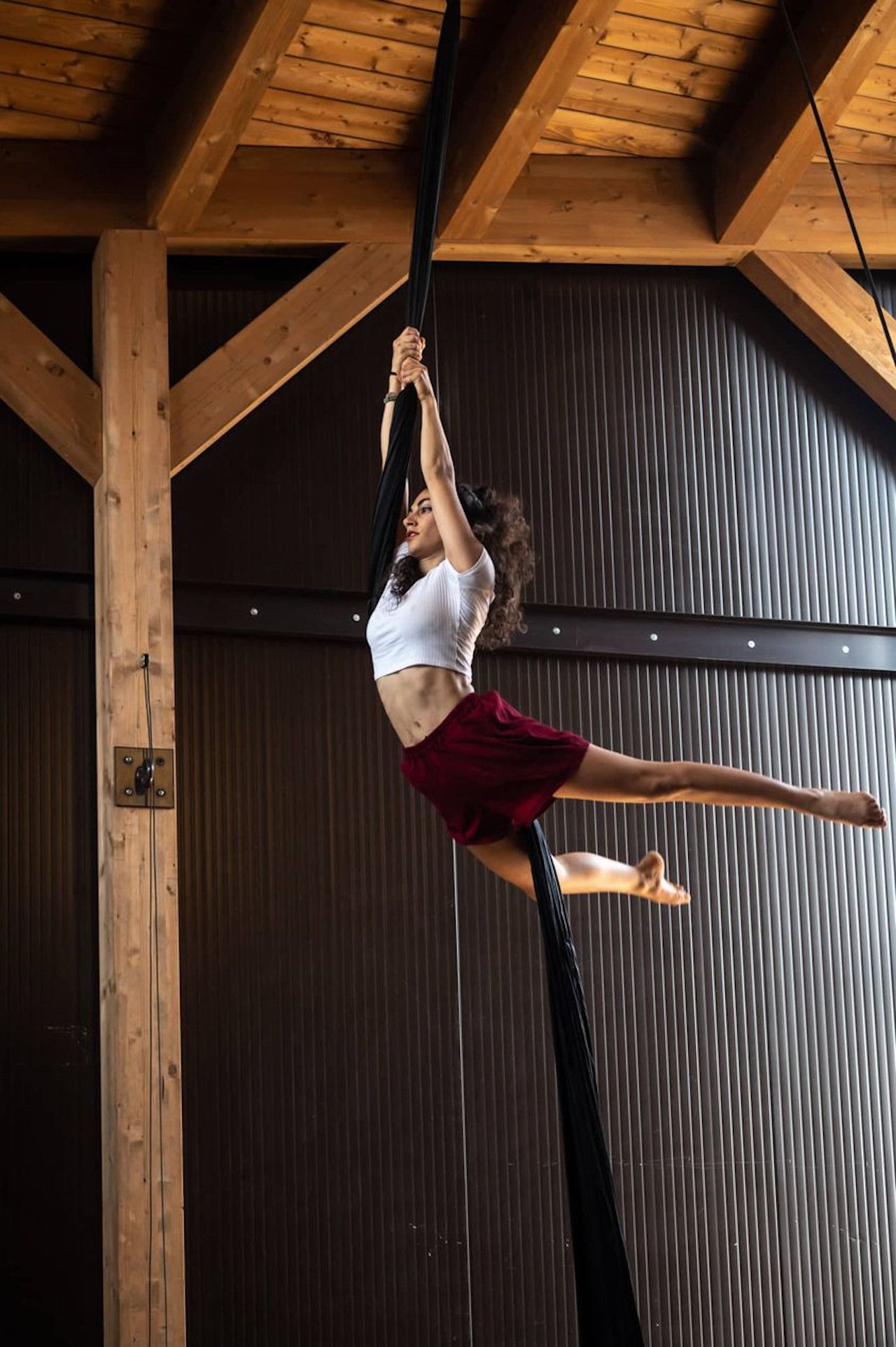 Aerial Dance – Εναέριος χορός Τι είναι ο εναέριος χορός: Ο εναέριος χορός είναι ένα είδος ακροβατικής χορευτικής γυμναστικής σε κάθετο άξονα. Ειδικά μεγάλα πανιά, που έχουν τοποθετηθεί στο ταβάνι χρησιμοποιούνται για να χορεύει κανείς στον αέρα. Όλοι οι μύες του σώματος ενεργοποιούνται προκειμένου το σώμα να αποκτήσει δύναμη και να “δώσει” την απαραίτητη κίνηση επάνω στα πανιά. Αρχικά ο μαθητής/τρια, εξασκείται στο να σηκώσει το βάρος του από το έδαφος και έπειτα από ορισμένα μαθήματα, σε συνδυασμό με την τεχνική δεσίματος, κατορθώνει να ακολουθεί ποικίλες “ροές”, να χορεύει και να εκφράζεται επάνω στα πανιά σε ύψος. Η εξοικείωση με το ύψος γίνεται παιχνίδι και η αίσθηση της κίνησης επάνω στα πανιά γίνεται μαγική. Είναι επικίνδυνο; Όχι γιατί: Ο χώρος είναι διαμορφωμένος για να παρέχει ασφάλεια στο μαθητευόμενο, εφόσον τα πανιά είναι τοποθετημένα από την οροφή με ασφαλή τρόπο για την στήριξη τους. Επίσης χρησιμοποιούνται ειδικά προστατευτικά στρώματα κάτω από το κάθε πανί, ώστε σε περίπτωση πτώσης να αποφεύγεται ενδεχόμενος τραυματισμός. Τέλος, είναι ανεξάρτητο από την εμπειρία του μαθητή από τη γυμναστική και το χορό και είναι κατάλληλο για όλους τους τύπους του σώματος.