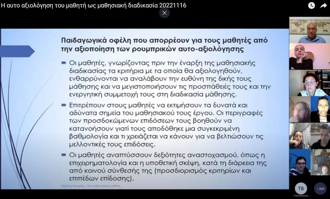 Εισηγητής στην 1η επιμορφωτική συνάντηση εκπαιδευτικών ήταν ο Μιχάλης Σκουμιός, Καθηγητής στο Παιδαγωγικό Τμήμα Δημοτικής Εκπαίδευσης του Πανεπιστημίου Αιγαίου, ο οποίος ανέπτυξε το θέμα: «Η αυτο-αξιολόγηση του μαθητή ως μαθησιακή διαδικασία». Η εισήγηση αποσκοπούσε να αποσαφηνίσει την έννοια της αυτο-αξιολόγησης του μαθητή, να εκθέσει τους λόγους που καθιστούν αναγκαία τη χρήση της, να παρουσιάσει τα στάδια εφαρμογής της και κυρίως να εξοικειώσει τους εκπαιδευτικούς με τις διάφορες διδακτικές στρατηγικές με τις οποίες μπορεί να εφαρμοστεί στο πλαίσιο της εκπαιδευτικής πράξης. Κατά τη διάρκεια της εισήγησης δημιουργήθηκαν ολιγομελείς ομάδες εργασίας εκπαιδευτικών όπου σε «εικονικά δωμάτια» οι εκπαιδευτικοί υλοποίησαν συνεργατικά δραστηριότητες.