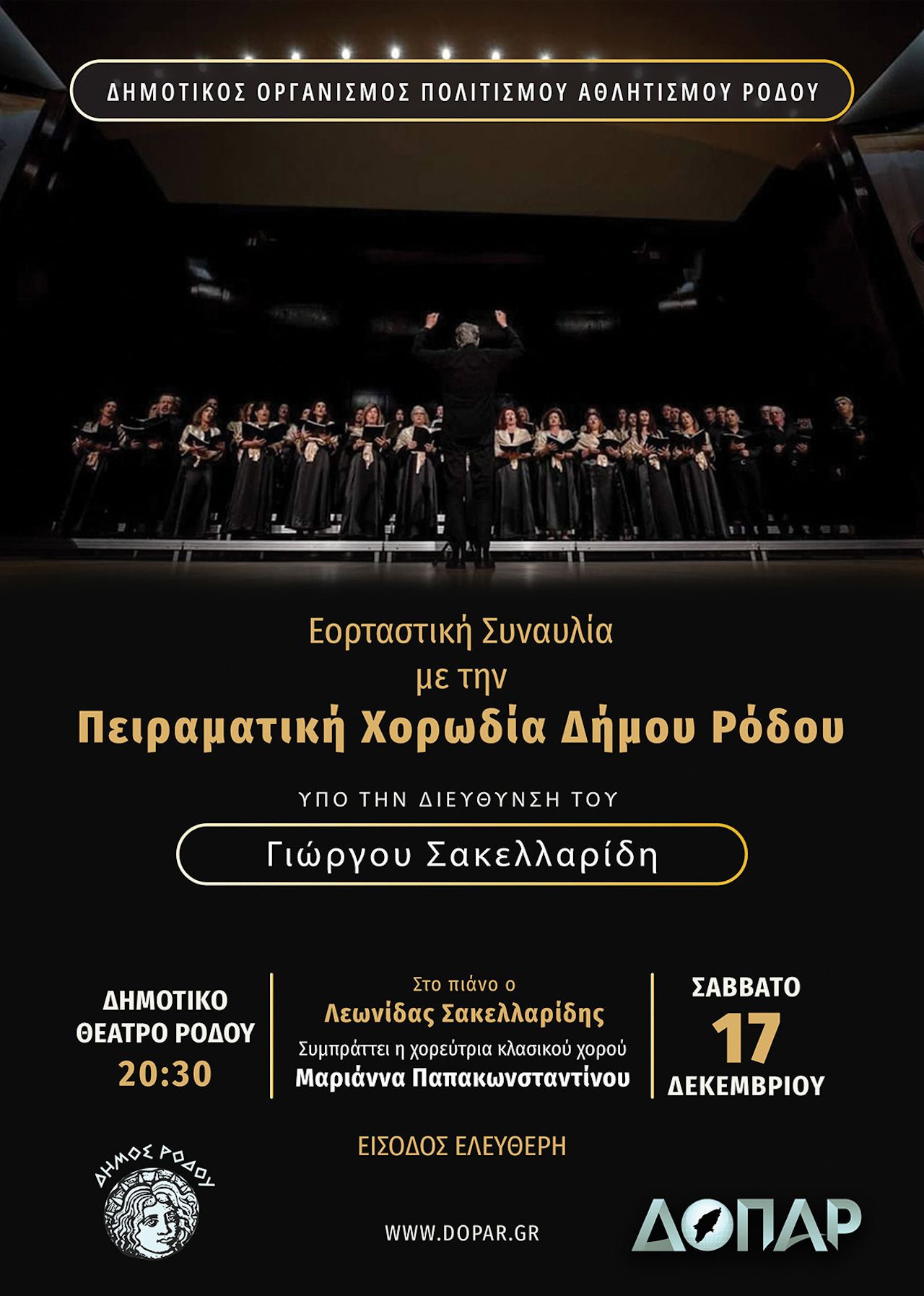 Από τον Δημοτικό Οργανισμό Πολιτισμού – Αθλητισμού Ρόδου ανακοινώνεται ότι η Πειραματική Χορωδία Δήμου Ρόδου, υπό την διεύθυνση του Γιώργου Σακελλαρίδη, θα πραγματοποιήσει εορταστική συναυλία το Σάββατο 17 Δεκεμβρίου, στις 8.30 μ.μ., στο Δημοτικό Θέατρο με ελεύθερη είσοδο.