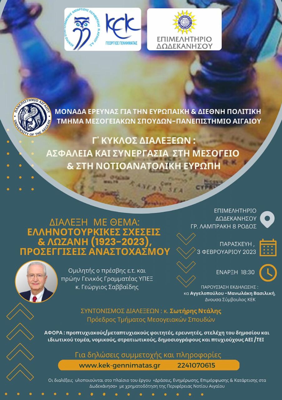 Η Μονάδα Έρευνας για την Ευρωπαϊκή & Διεθνή Πολιτική του Τμήματος Μεσογειακών Σπουδών του Πανεπιστήμιου Αιγαίου, το Επιμελητήριο Δωδεκανήσου και το Κ.Ε.Κ Γεννηματάς της Περιφέρειας Νοτίου Αιγαίου συνδιοργανώνουν το Γ’ Κύκλο Διαλέξεων με θέμα: «Ασφάλεια και συνεργασία στη Μεσόγειο & στη νοτιοανατολική Ευρώπη» Ο Γ΄κύκλος περιλαμβάνει τρεις έως σήμερα προγραμματισμένες διαλέξεις, οι οποίες θα ξεκινήσουν […]