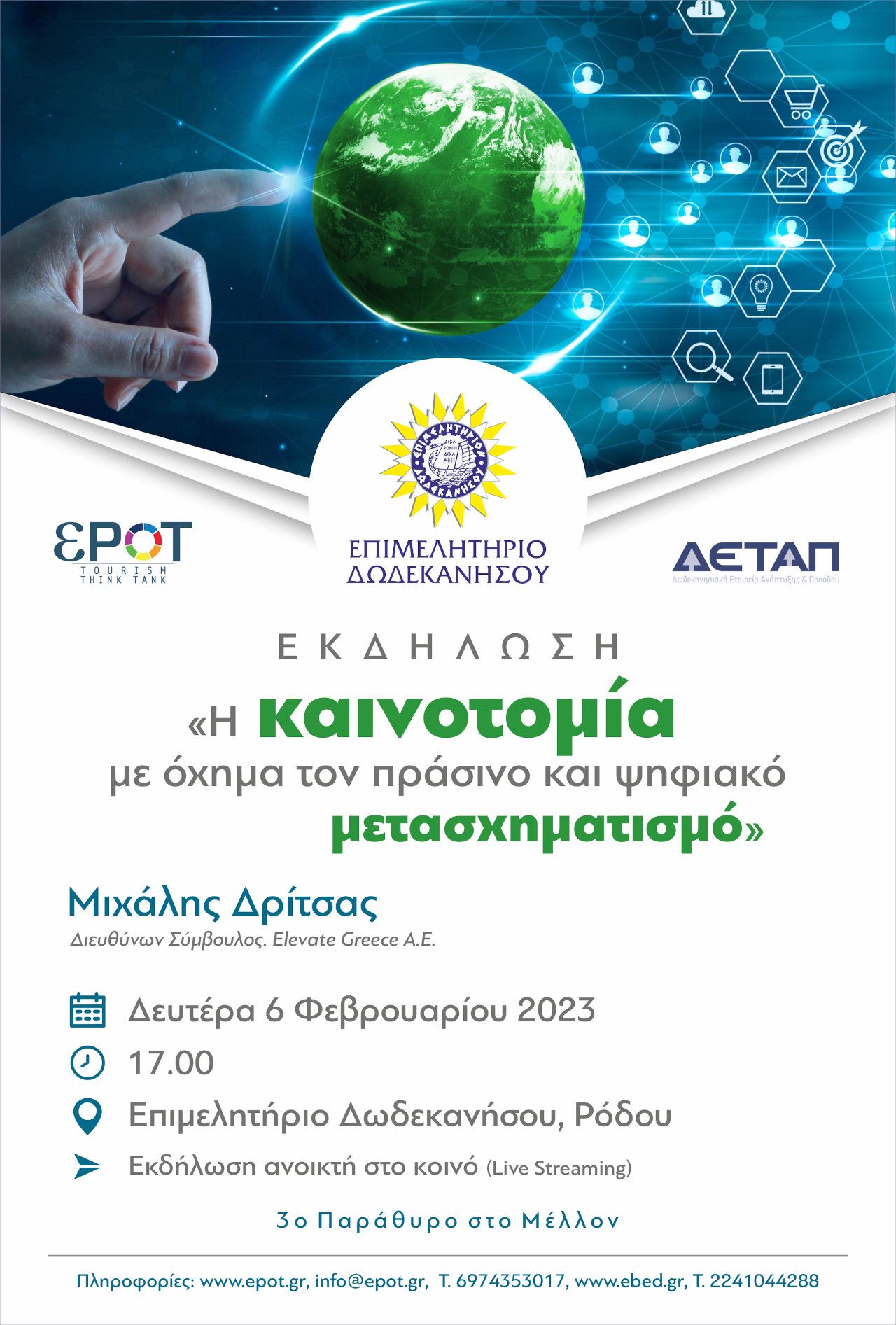 Το Επιμελητήριο Δωδεκανήσου, η ΕΠΟΤ Tourism Think Tank και η ΔΕΤΑΠ, συνδιοργανώνουν εκδήλωση με θέμα «Η καινοτομία ως όχημα για τον πράσινο και ψηφιακό μετασχηματισμό», με ομιλητή τον Μιχάλη Δρίτσα, Διευθύνοντα Σύμβουλο της Elevate Greece A.E., τη Δευτέρα 6/02/23, ώρα 17.00, στο Επιμελητήριο Δωδεκανήσου – Ρόδος, ανοικτή για το κοινό.