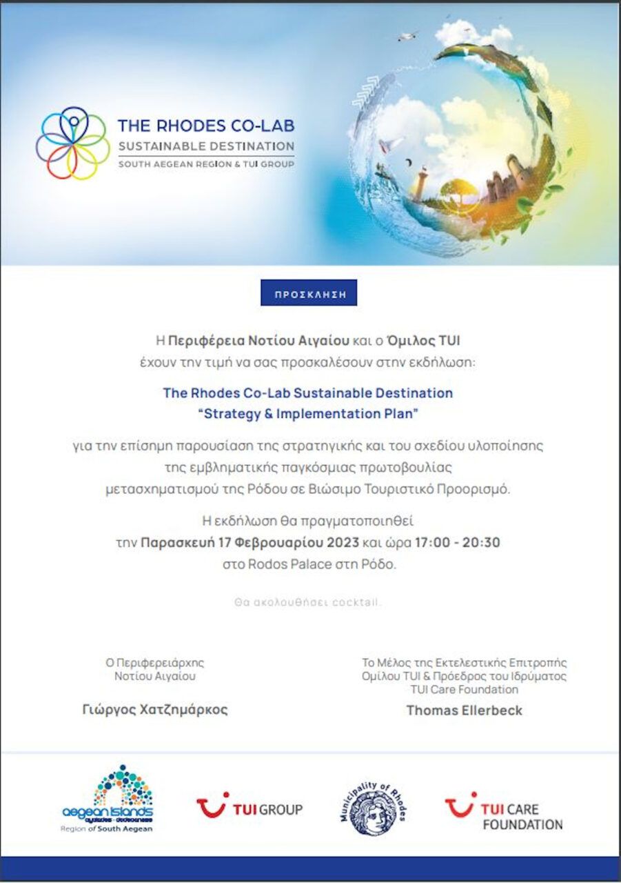 Η Περιφέρεια Νοτίου Αιγαίου και ο Όμιλος TUI έχουν την τιμή να σας προσκαλέσουν στην εκδήλωση: The Rhodes Co-Lab Sustainable Destination “Strategy & Implementation Plan” για την επίσημη παρουσίαση της στρατηγικής και του σχεδίου υλοποίησης της εμβληματικής παγκόσμιας πρωτοβουλίας μετασχηματισμού της Ρόδου σε Βιώσιμο Τουριστικό Προορισμό. Η εκδήλωση θα πραγματοποιηθεί την Παρασκευή 17 Φεβρουαρίου 2023 […]