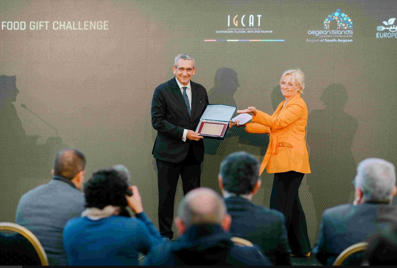 Μία έκπληξη περίμενε τον Περιφερειάρχη κ. Χατζημάρκο, όταν η Πρόεδρος του Διεθνούς Δικτύου Γαστρονομίας IGCAT, Dr. Diane Dodd, του απένειμε τιμητική πλακέτα ανακηρύσσοντάς τον επισήμως επίτιμο Πρέσβη Γαστρονομίας, αναφέροντας χαρακτηριστικά: «Το δίκτυο μας με περισσότερους από 100 ειδικούς διασκορπισμένους σε όλη την υφήλιο μοιραζόμαστε όλοι την ευγνωμοσύνη μας που μας δείξατε τι σημαίνει ανθεκτικότητα, τι σημαίνει κουράγιο και για την εξαιρετική προσπάθεια να προωθήσετε και να προστατέψετε τη γαστρονομική και πολιτιστική κληρονομιά του Νοτίου Αιγαίου».