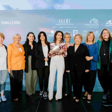 1, 2: οι παρουσιάστριες της τελετής απονομής Πρόεδρος του IGCAT, Dr. Diane Dodd και η υπεύθυνη Επικοινωνίας της Περιφέρειας Νοτίου Αιγαίου, Βάσια Παπαηλία