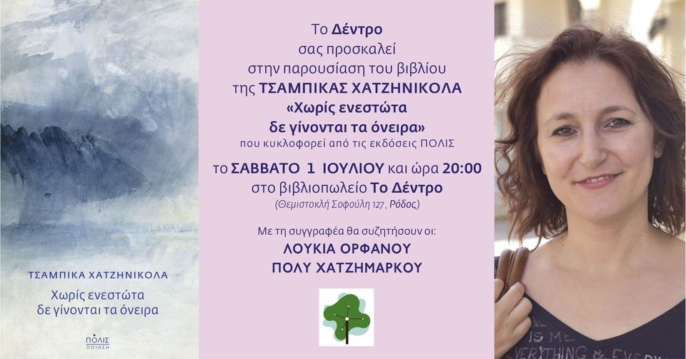 Σας προσκαλούμε στην παρουσίαση της ποιητικής συλλογής της Τσαμπίκας Χατζηνικόλα «Χωρίς ενεστώτα δε γίνονται όνειρα» που κυκλοφορεί από τις εκδόσεις ΠΟΛΙΣ το Σάββατο 1 Ιουλίου και ώρα 20:00 στο βιβλιοπωλείο «Το Δέντρο» (Θεμ. Σοφούλη 127, Ρόδος) Με τη συγγραφέα θα συζητήσουν οι: Λουκία Ορφανού, Πόλυ Χατζημάρκου
