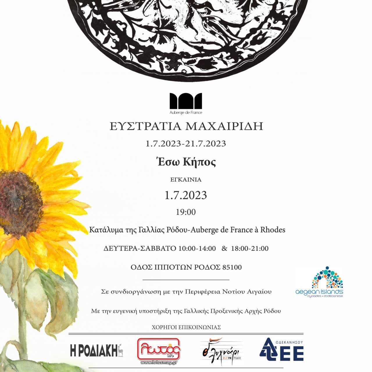Στην Μεσαιωνική πόλη της Ρόδου, στο Κατάλυμα της Γαλλίας, Οδός Ιπποτών, η εικαστικός Ευστρατία Μαχαιρίδη παρουσιάζει τη νέα ατομική της έκθεση με έργα Ζωγραφικής και Χαρακτικής, με τίτλο «Έσω Κήπος». Η έκθεση εγκαινιάζεται το Σάββατο 1 Ιουλίου στις 19:00, σε συνδιοργάνωση της Περιφέρειας Νοτίου Αιγαίου και την ευγενική υποστήριξη της Γαλλικής Προξενικής Αρχής Ρόδου. Διάρκεια […]