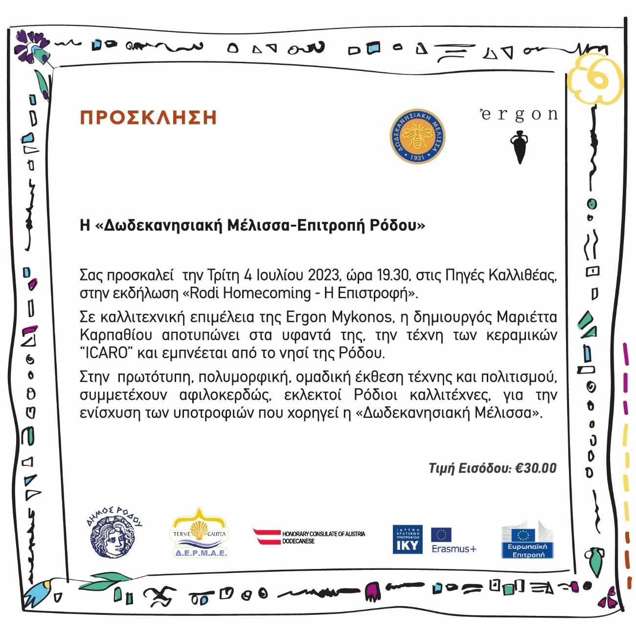 “Rodi-Ηomecoming – Η Επιστροφή”, είναι η πρωτότυπη πολυμορφική ομαδική έκθεση, τέχνης και πολιτισμού, σε καλλιτεχνική επιμέλεια της “ergon mykonos” υπό την αιγίδα και για τον φιλανθρωπικό σκοπό της Δωδεκανησιακής Μέλισσας Παράρτημα Ρόδου, που θα πραγματοποιηθεί στη Ρόδο, στις Πηγές Καλλιθέας στις 4 Ιουλίου 2023.