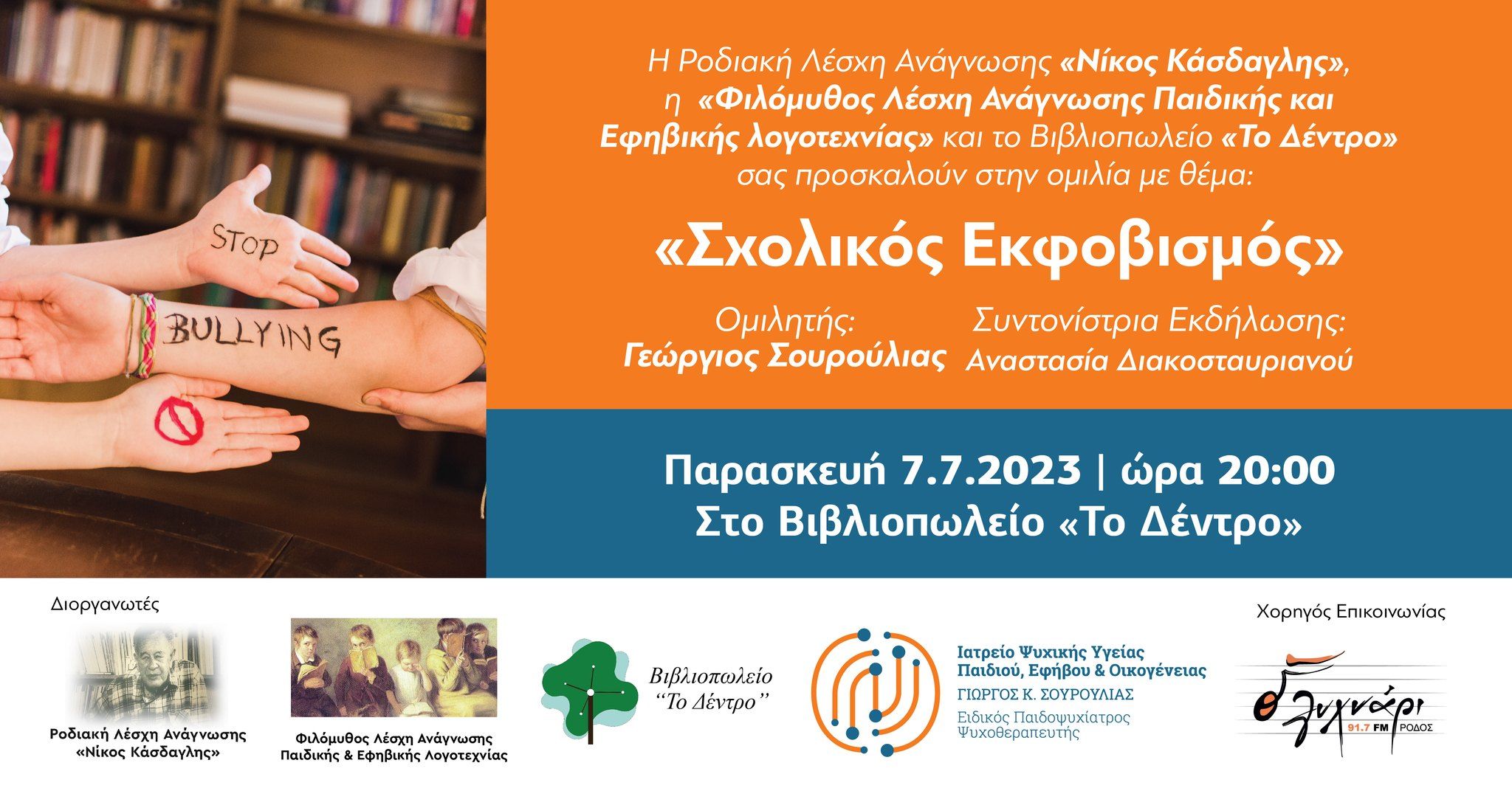 Η Ροδιακή Λέσχη Ανάγνωσης «Νίκος Κάσδαγλης», η Φιλόμυθος Λέσχη Ανάγνωσης Παιδικής και Εφηβικής λογοτεχνίας και το Βιβλιοπωλείο «Το Δέντρο» σας προσκαλούν στην ομιλία με θέμα: «Σχολικός Εκφοβισμός», την Παρασκευή 7 Ιουλίου και ώρα 20:00, στο Βιβλιοπωλείο Το Δέντρο.