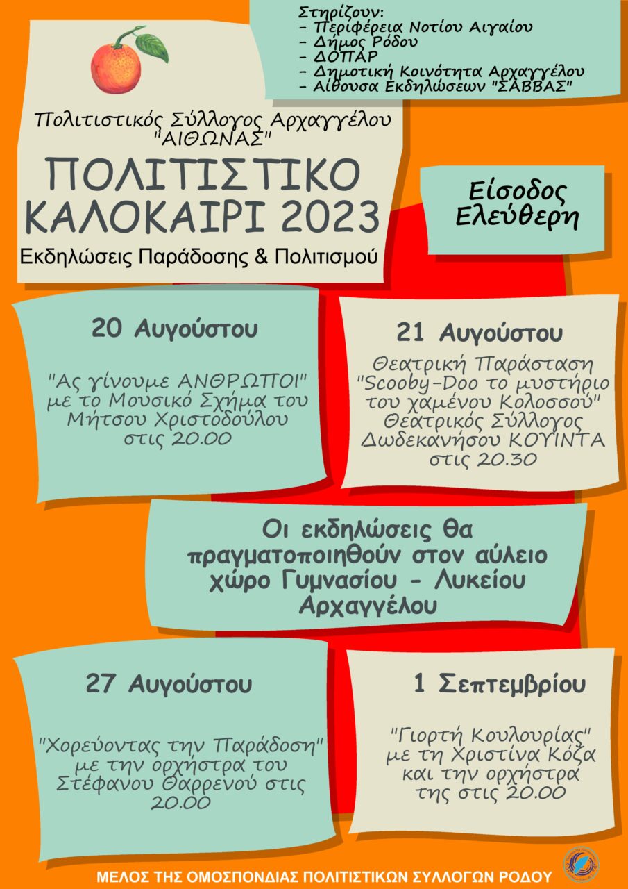 Συνεπής και το φετινό καλοκαίρι στο πολιτιστικό ραντεβού του, ο Πολιτιστικός Σύλλογος Αρχαγγέλου «ΑΙΘΩΝΑΣ», σε συνεργασία με τη με την Περιφέρεια Νοτίου Αιγαίου, το Δήμο Ρόδου, το ΔΟΠΑΡ, τη Δημοτική Κοινότητα Αρχαγγέλου ανακοινώνουν ένα πλούσιο και ποιοτικό πολιτιστικό πρόγραμμα για το καλοκαίρι του 2023. Οι εκδηλώσεις θα πραγματοποιηθούν στον αύλειο χώρο του Γυμνασίου – Λυκείου […]