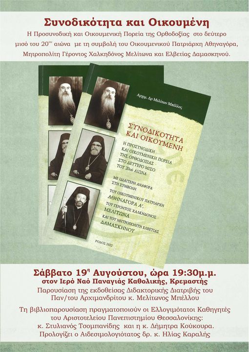 Αύγουστος 2023 Πέμπτη 17η Αυγούστου, ώρα 20:00 μ.μ. Παρουσίαση Τραγουδιών, από σχήμα Χορωδίας. Διεύθυνση κ. Αναστάσιος Κουδούνης. Σάββατο 19η Αυγούστου, ώρα 19:30μ.μ. Παρουσίαση της εκδοθείσας Διδακτορικής Διατριβής του Παν/του Αρχιμανδρίτου κ. Μελίτωνος Μπέλλου: « Συνοδικότητα και Οικουμένη: Η Προσυνοδική και Οικουμενική Πορεία της Ορθοδοξίας στο δεύτερο μισό του 20ου αιώνα με τη συμβολή του Οικουμενικού […]