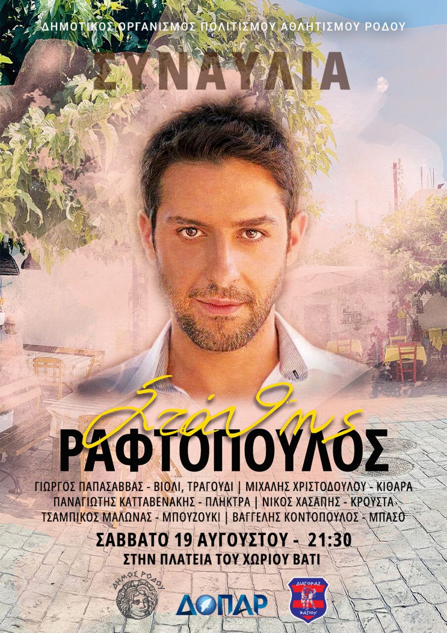 Ο Δημοτικός Οργανισμός Πολιτισμού Αθλητισμού Ρόδου (ΔΟΠΑΡ) σε συνεργασία με τον ΑΣ Διαγόρα Βατίου διοργανώνουν συναυλία με τον Στάθη Ραφτόπουλο στην πλατεία του χωριού Βάτι, το Σάββατο 19 Αυγούστου, στις 21:00. Είσοδος ελεύθερη. Παίζουν οι μουσικοί: Γιώργος Παπασάββας – βιολί & τραγούδι, Μιχάλης Χριστοδούλου – κιθάρα, Παναγιώτης Κατταβενάκης – πλήκτρα, Νικος Χασάπης – κρουστά, Τσαμπίκος […]