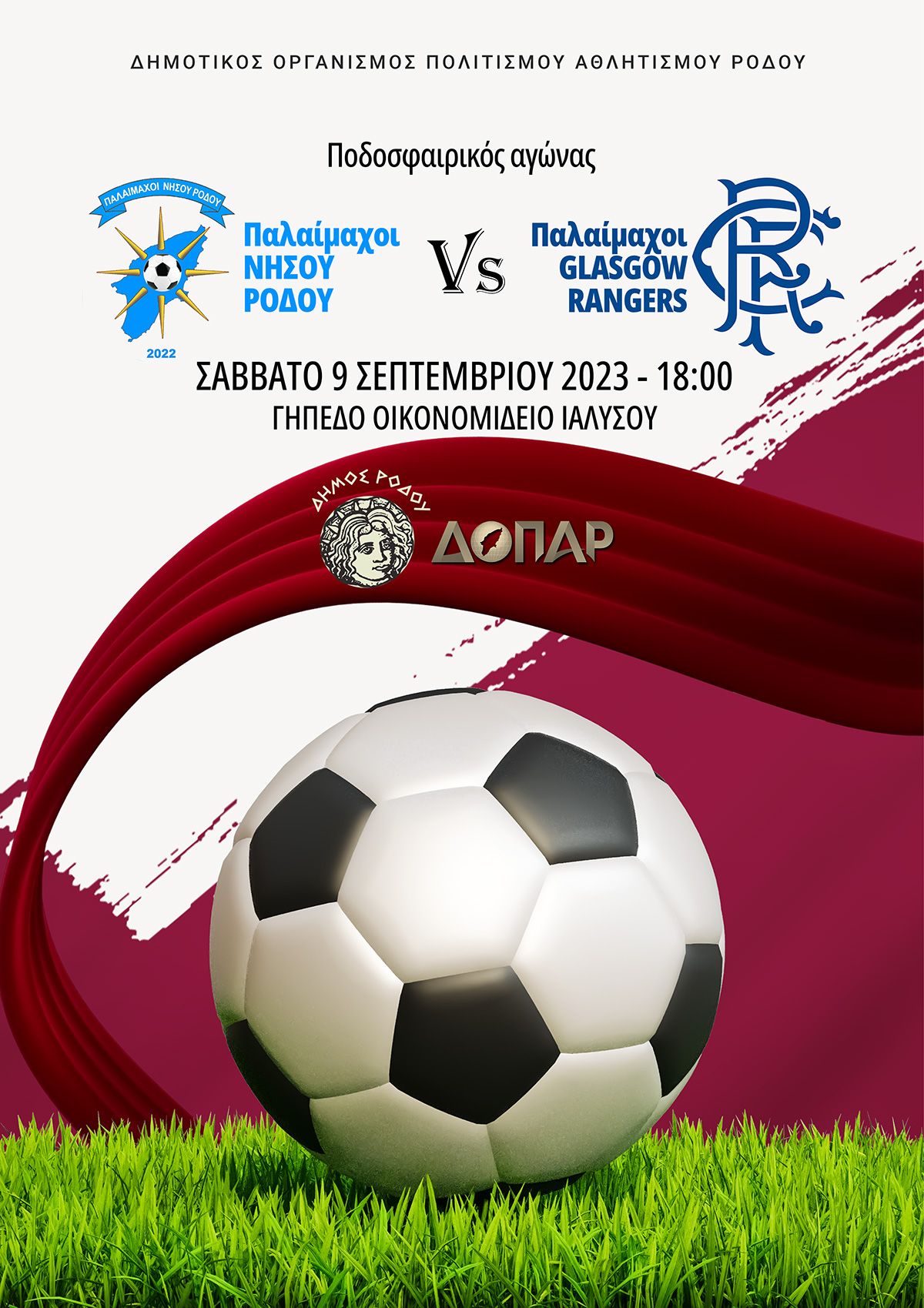Ο Δήμαρχος Ρόδου Αντώνης Β. Καμπουράκης και ο Πρόεδρος του ΔΟΠΑΡ Τέρης Χατζηιωάννου, σας προσκαλούν στον Φιλικό ποδοσφαιρικό αγώνα Παλαιμάχων Νήσου Ρόδου – Ρέιντζερς Γλασκώβης που θα πραγματοποιηθεί το προσεχές Σάββατο 9 Σεπτεμβρίου στις 6.00 μ.μ., στο Γήπεδο Ιαλυσού.