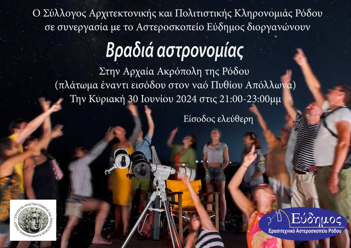 Με αφορμή την Παγκόσμια Ημέρα Αστεροειδών, ο Σύλλογος Αρχιτεκτονικής και Πολιτιστικής Κληρονομιάς Ρόδου σε συνεργασία με το Αστεροσκοπείο Εύδημος σας προσκαλούν την Κυριακή 30 Ιουνίου 2024 και ώρα 21.00 μ.μ., στον αρχαιολογικό χώρο της Ακρόπολης Ρόδου (πλάτωμα έναντι της εισόδου στον ναό του Πυθίου Απόλλωνα) σε μία μαγική βραδιά παρατήρησης των ουράνιων σωμάτων.