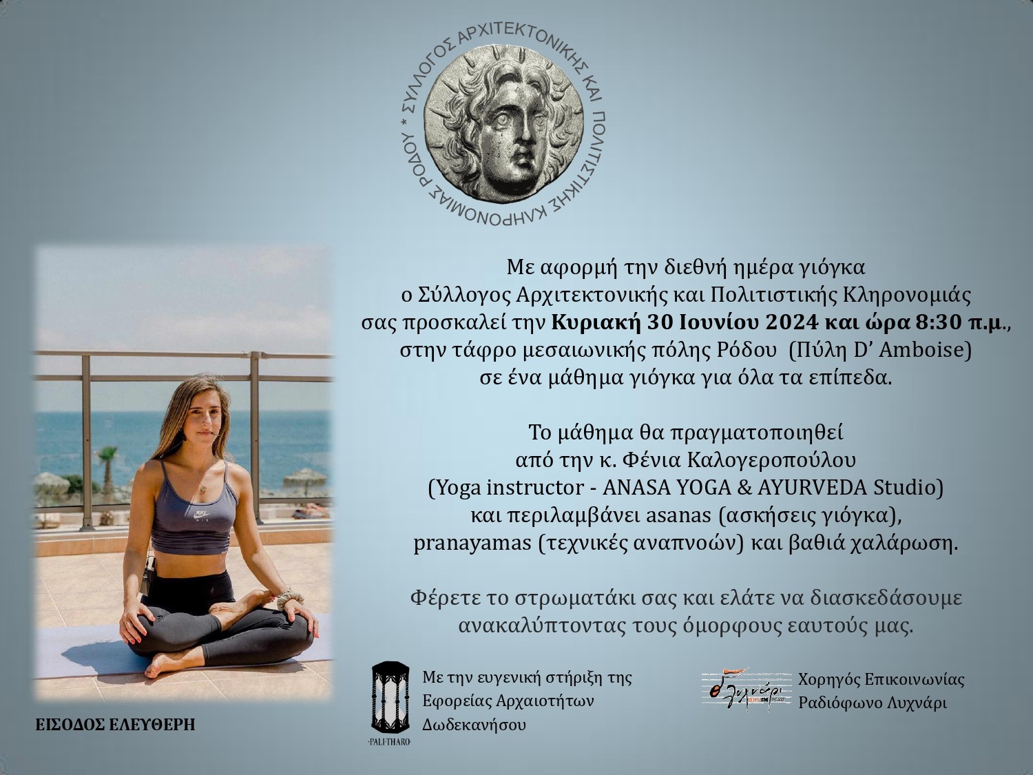 Με αφορμή τη Διεθνή Ημέρα Γιόγκα ο Σύλλογος Αρχιτεκτονικής και Πολιτιστικής Κληρονομιάς Ρόδου σας προσκαλεί την Κυριακή 30 Ιουνίου 2024 και ώρα 8:30 π.μ., στην Τάφρο μεσαιωνικής πόλης (πύλη D’ Amboise) σε ένα μάθημα γιόγκα για όλα τα επίπεδα. Φέρτε το στρωματάκι σας και ελάτε να διασκεδάσουμε ανακαλύπτοντας τους όμορφους εαυτούς μας.