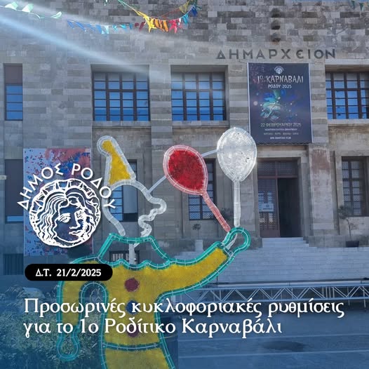 Ο Δήμος Ρόδου ενημερώνει τους πολίτες ότι, λόγω διεξαγωγής του 1ου Ροδίτικου Καρναβαλιού, θα ισχύσουν οι παρακάτω κυκλοφοριακές ρυθμίσεις το Σάββατο 22 Φεβρουαρίου 2025: