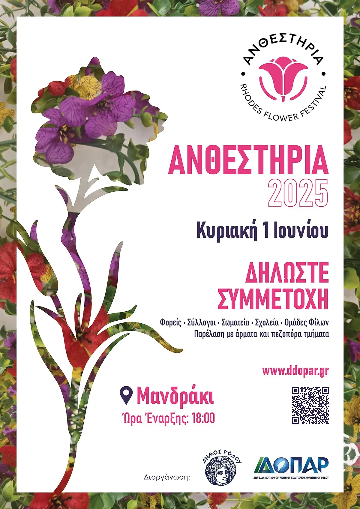 Ο Δήμος Ρόδου σας προσκαλεί να συμμετάσχετε στα ΑΝΘΕΣΤΗΡΙΑ 2025, στη μεγάλη γιορτή της Άνοιξης με λουλούδια, χρώματα κι αρώματα!