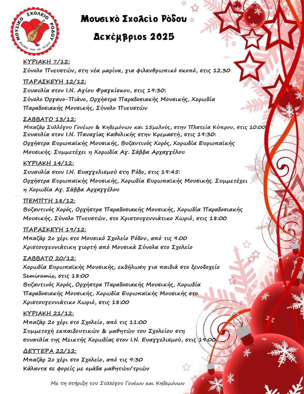 Ο Δεκέμβριος ανήκει στη μουσική! Το Μουσικό Σχολείο Ρόδου σας προσκαλεί στις εορταστικές του εκδηλώσεις, με τη στήριξη του Συλλόγου Γονέων και Κηδεμόνων. Δείτε το πρόγραμμα και ελάτε να στηρίξετε την προσπάθεια των μαθητών μας: Παρασκευή 12/12: Συναυλία στον Ι.Ν. Αγίου Φραγκίσκου, ώρα 19:30. (Συμμετέχουν Οργανικό-Πιάνο, Ορχήστρα Παραδοσιακής Μουσικής κ.ά.). Σάββατο 13/12: Συναυλία στον Ι.Ν. […]