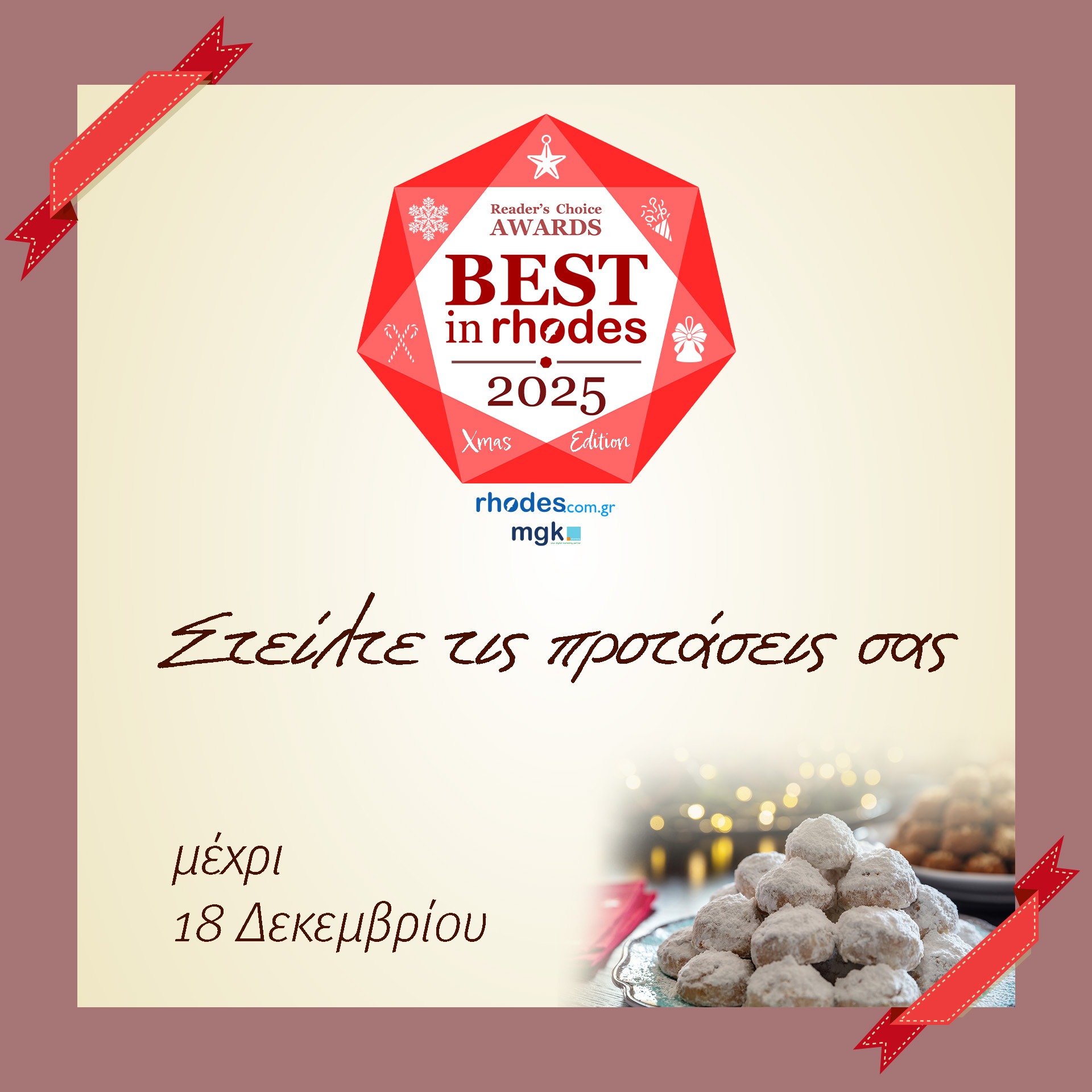 Τα Best in Rhodes – Reader’s Choice Awards, τα αγαπημένα βραβεία κοινού της Ρόδου, επιστρέφουν με μια λαμπερή, μοναδική Χριστουγεννιάτικη Έκδοση για το 2025. Οι πολίτες καλούνται να αναδείξουν τους κορυφαίους της τοπικής αγοράς στις πιο γιορτινές κατηγορίες, με τα αποτελέσματα να ανακοινώνονται θριαμβευτικά την Παραμονή των Χριστουγέννων!