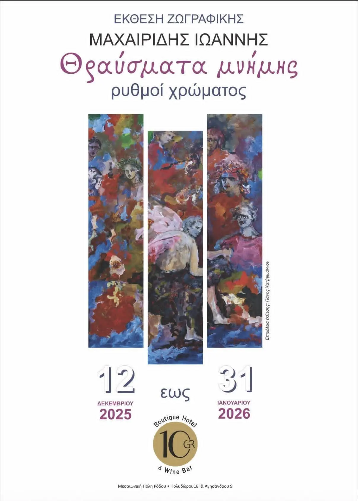 Η Boutique Hotel 1GR & Wine Bar σας προσκαλεί στα εγκαίνια της ατομικής έκθεσης ζωγραφικής του Ιωάννη Μαχαιρίδη με τίτλο «Θραύσματα Μνήμης – Ρυθμοί Χρώματος».