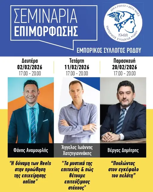 Εμπορικός Σύλλογος Ρόδου σας καλεί σε 3 μοναδικά ΔΩΡΕΑΝ σεμινάρια που θα αλλάξουν τον τρόπο που σκέφτεστε για την επιχείρησή σας