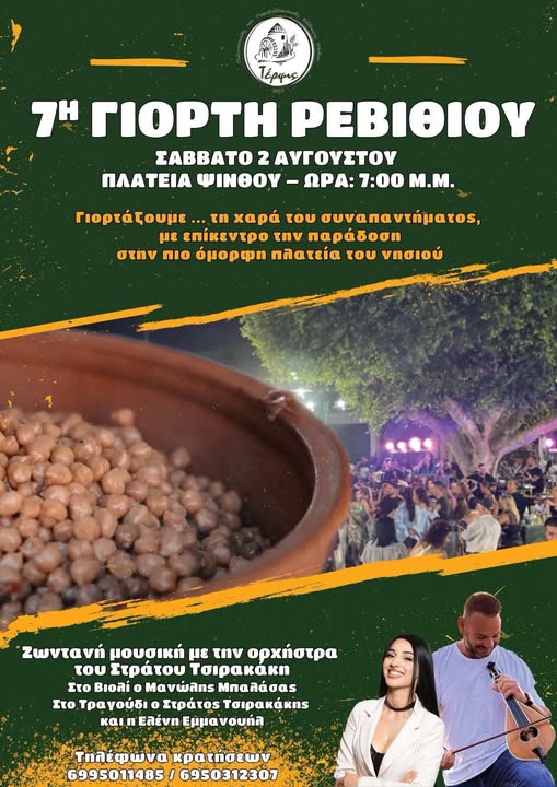 Ελάτε να γιορτάσουμε την 7η Γιορτή Ρεβιθιού στην πανέμορφη Πλατεία της Ψίνθου! Γιορτάζουμε τη χαρά του συναπαντήματος και αναβιώνουμε την παράδοση, στην πιο όμορφη πλατεία του νησιού.