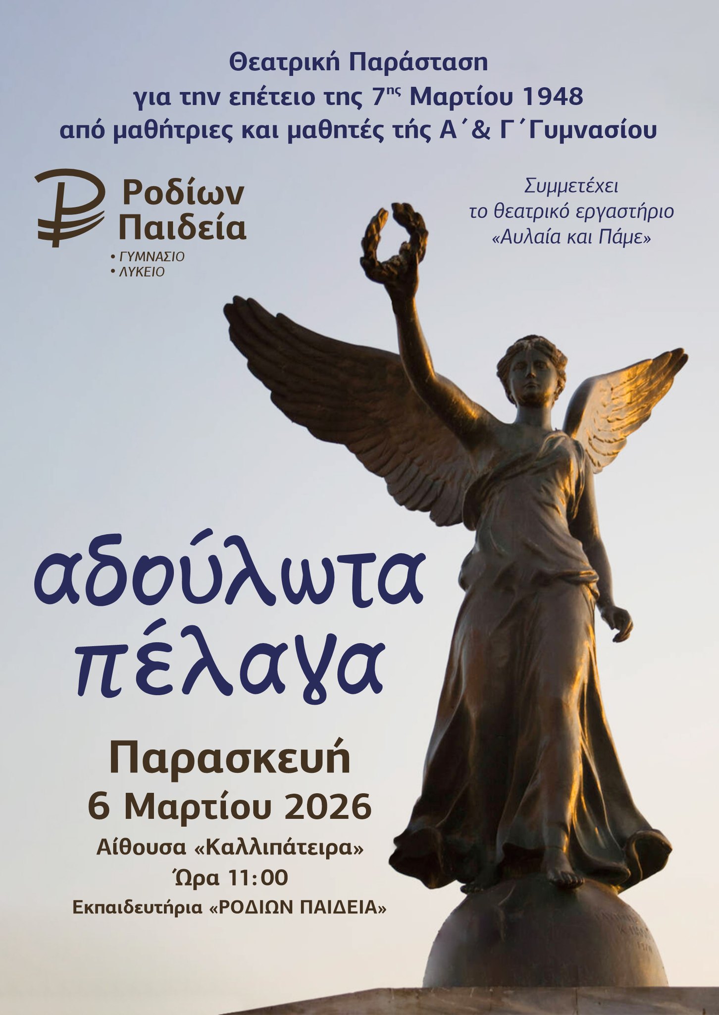 Τα παιδιά μας, μαθήτριες και μαθητές της Α’ και Γ’ Γυμνασίου των Εκπαιδευτηρίων μας, καθώς και μαθήτριες του θεατρικού εργαστηρίου «Αυλαία και Πάμε» του ομίλου μας, με τη θεατρική παράσταση «αδούλωτα πέλαγα» θα τιμήσουν την ιστορική ημέρα τής επίσημης τελετής τής ενσωμάτωσης της Δωδεκανήσου.
