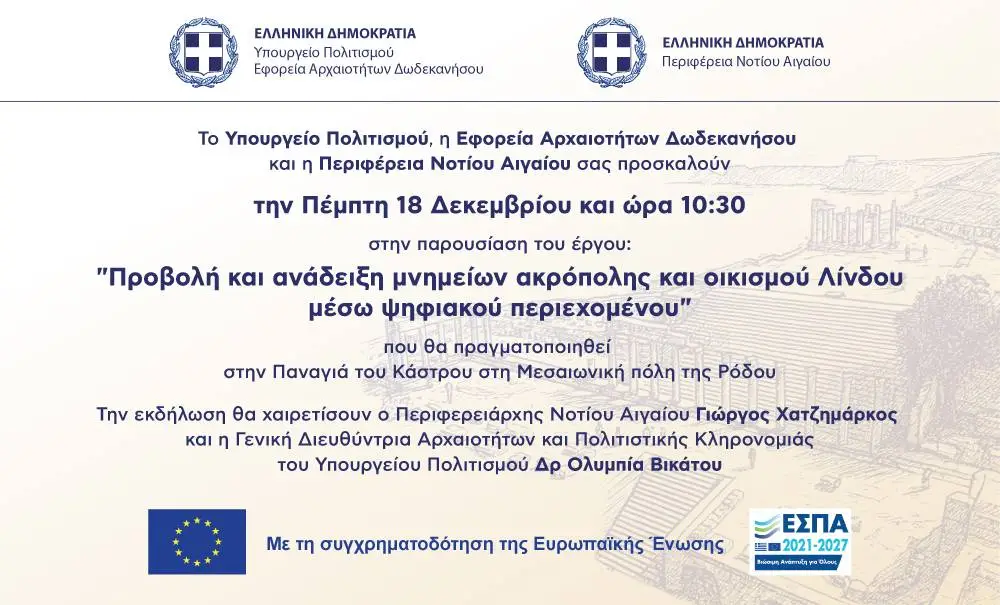Το Υπουργείο Πολιτισμού, η Εφορεία Αρχαιοτήτων Δωδεκανήσου και η Περιφέρεια Νοτίου Αιγαίου σας προσκαλούν στην παρουσίαση του έργου: “Προβολή και ανάδειξη μνημείων ακρόπολης και οικισμού Λίνδου μέσω ψηφιακού περιεχομένου”.