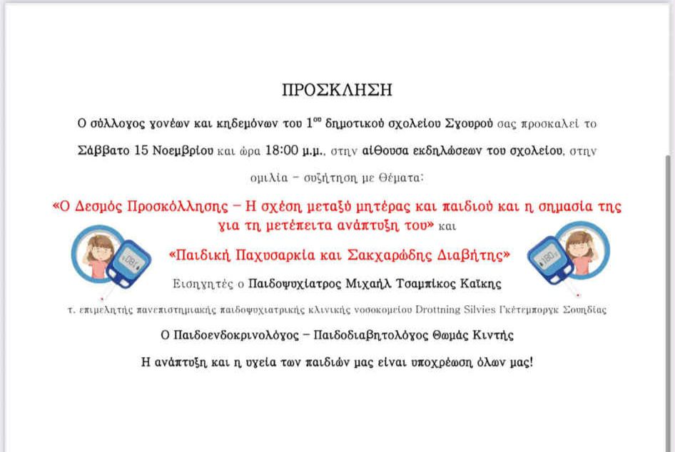 Ο Σύλλογος Γονέων και Κηδεμόνων του 1ου Δημοτικού Σχολείου Σγουρού σας προσκαλεί το Σάββατο 15 Νοεμβρίου 2025 και ώρα 18:00 στην αίθουσα εκδηλώσεων του σχολείου, σε μια ομιλία – συζήτηση με τα εξής θέματα: