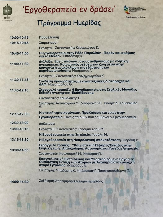 Ο Πανελλήνιος Σύλλογος Εργοθεραπευτών, με την υποστήριξη του Δήμου Ρόδου, θα διοργανώσει διήμερη εκδήλωση για την Παγκόσμια Ημέρα Εργοθεραπείας με τίτλο «Εργοθεραπεία εν δράσει».
